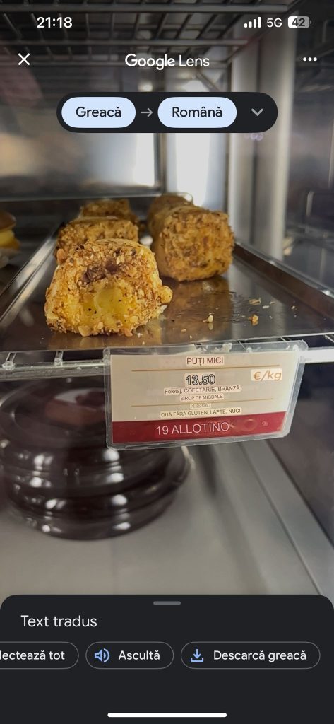 Să mergi în Grecia este întotdeauna o idee bună: mare, soare, gyros, dar și… traduceri amuzante. Da, ai citit bine. Totul a început cu o cafea într-o patiserie locală. Am vrut să aflu ce gustări dulci tradiționale găsesc, așa că am scos telefonul și am folosit traducerea automată din aplicația Google Lens, direct din poze. Și a iești un articol de blog!