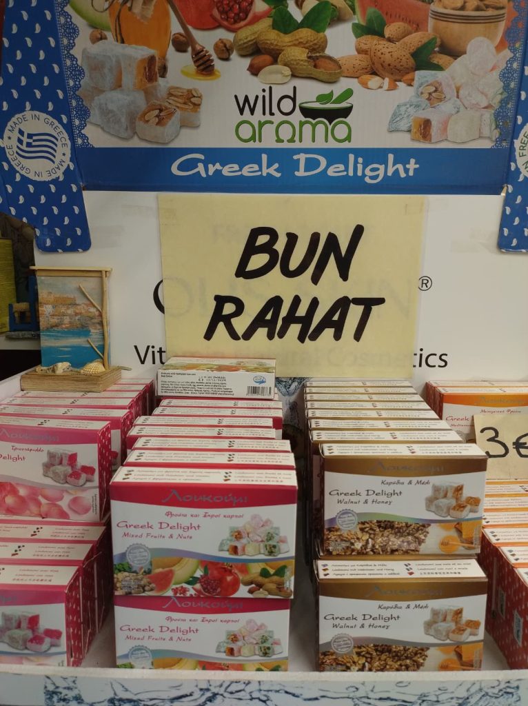 Apoi, într-un magazin cu dulciuri tradiționale, m-am oprit la celebrul „Greek Delight” pe care toată lumea îl cunoaște drept „rahat turcesc”. Dar cum româna este o limbă cu multe nuanțe, o traducere prea literală a rezultat în… „BUN RAHAT” scris mare, pe un afiș. Este bine să știi ce primești, dar uneori prea multă sinceritate nu este chiar apetisantă.