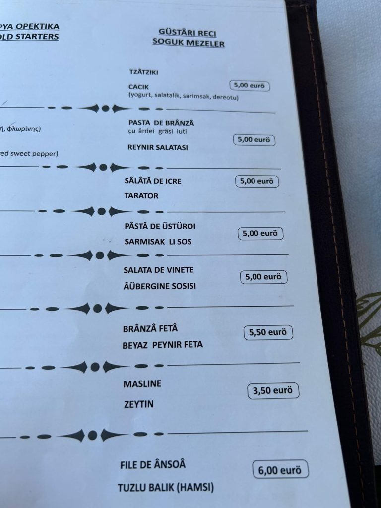 Dacă nu ai râs încă, așteaptă să vezi meniul. Deși la prima vedere pare tradus în română, diacriticele greșite și formulările forțate te fac să te întrebi dacă nu cumva meniul a fost trecut printr-un motor automat fără revizie umană. „Brânză fetă”, „sarmisak li sos” și „ăubergine sosisi” sunt doar câteva perle lingvistice care transformă o cină relaxantă într-un joc simpatic de ghicit.
